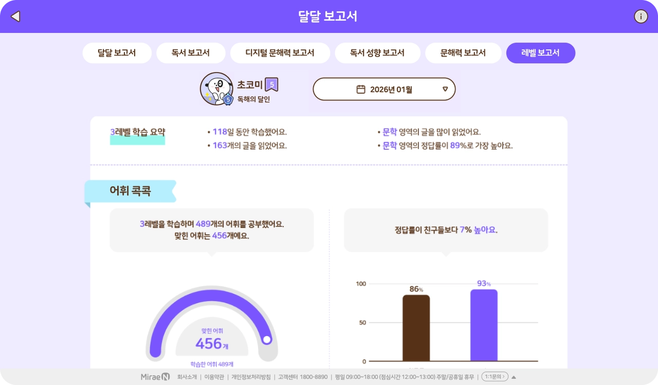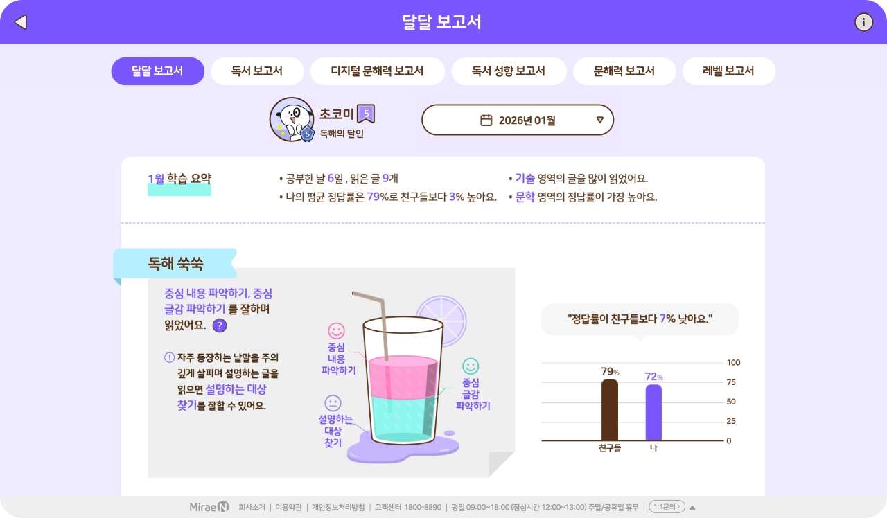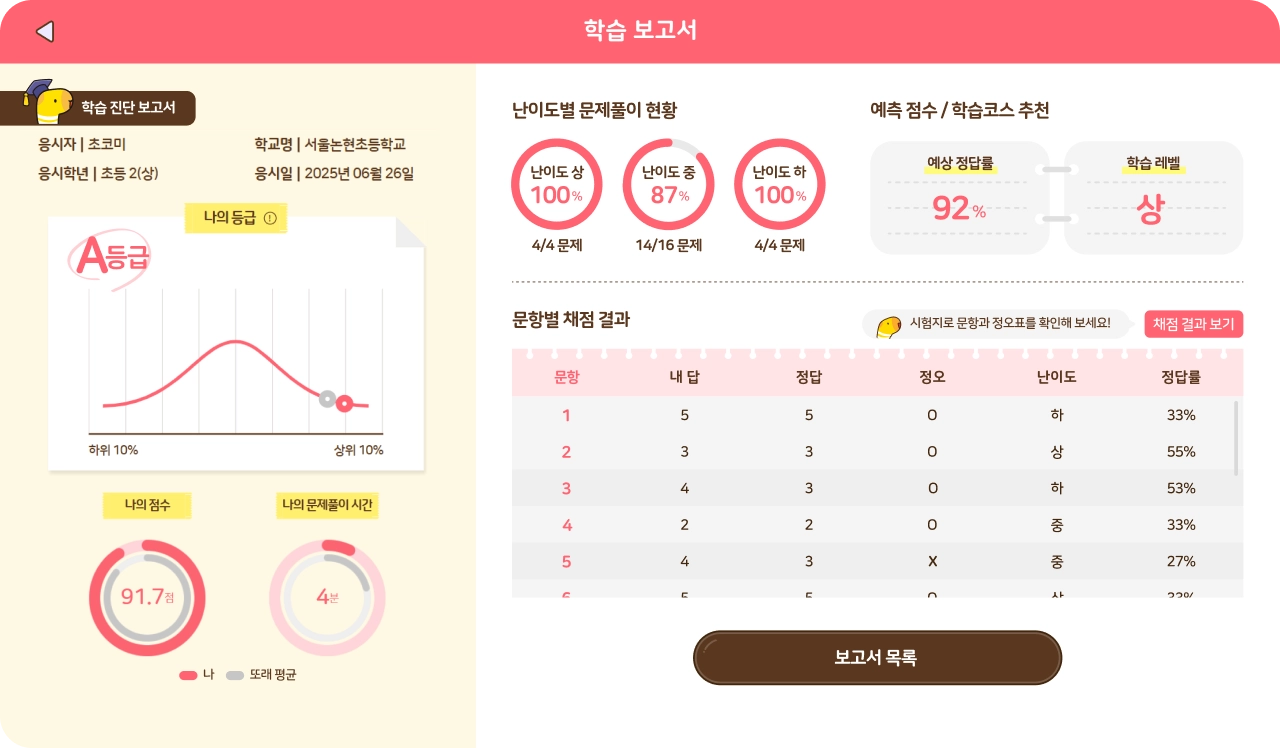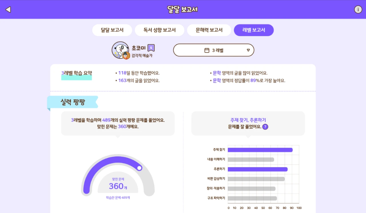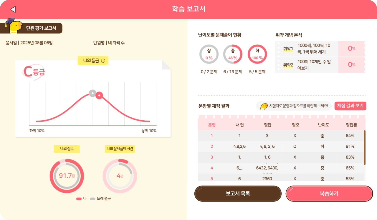 단원, 주간, 월간 리포트 및 성취도 분석 제공