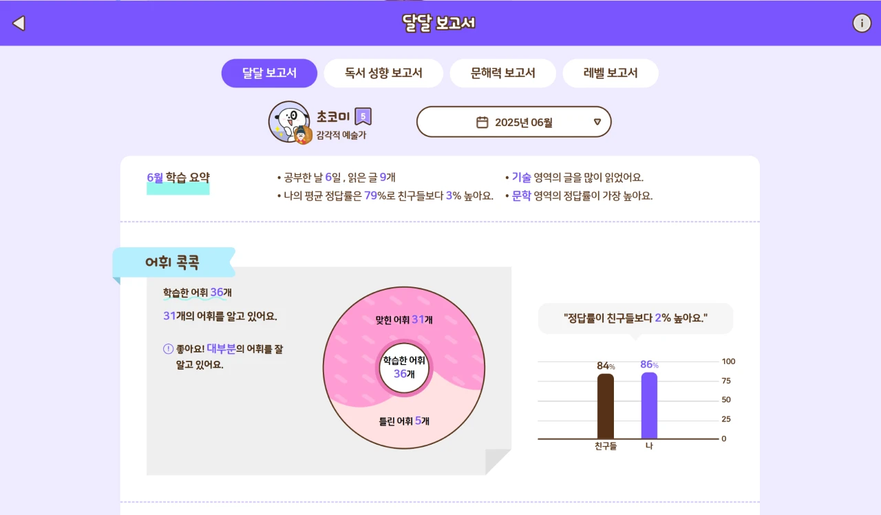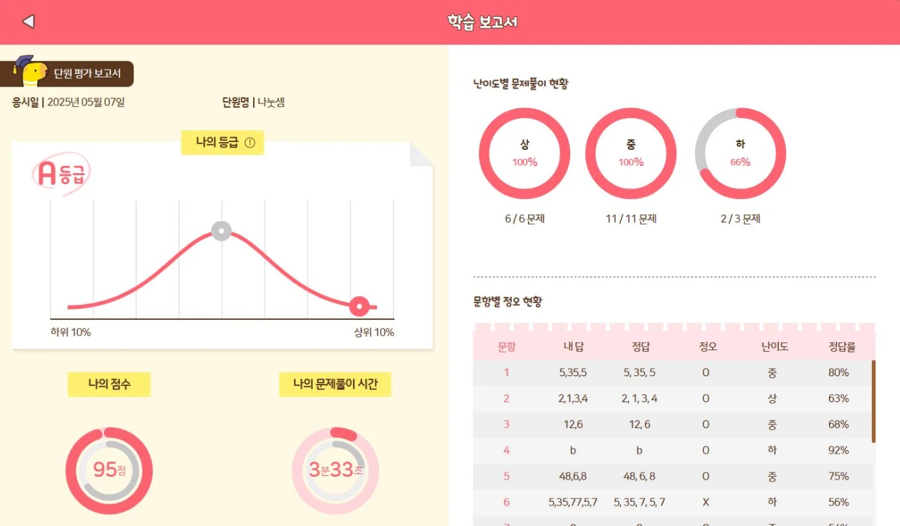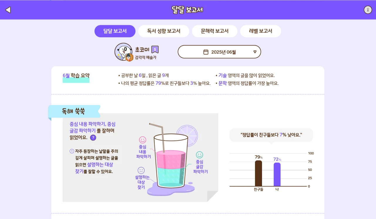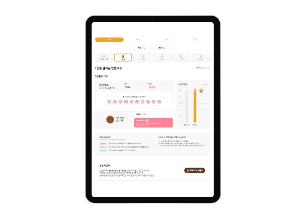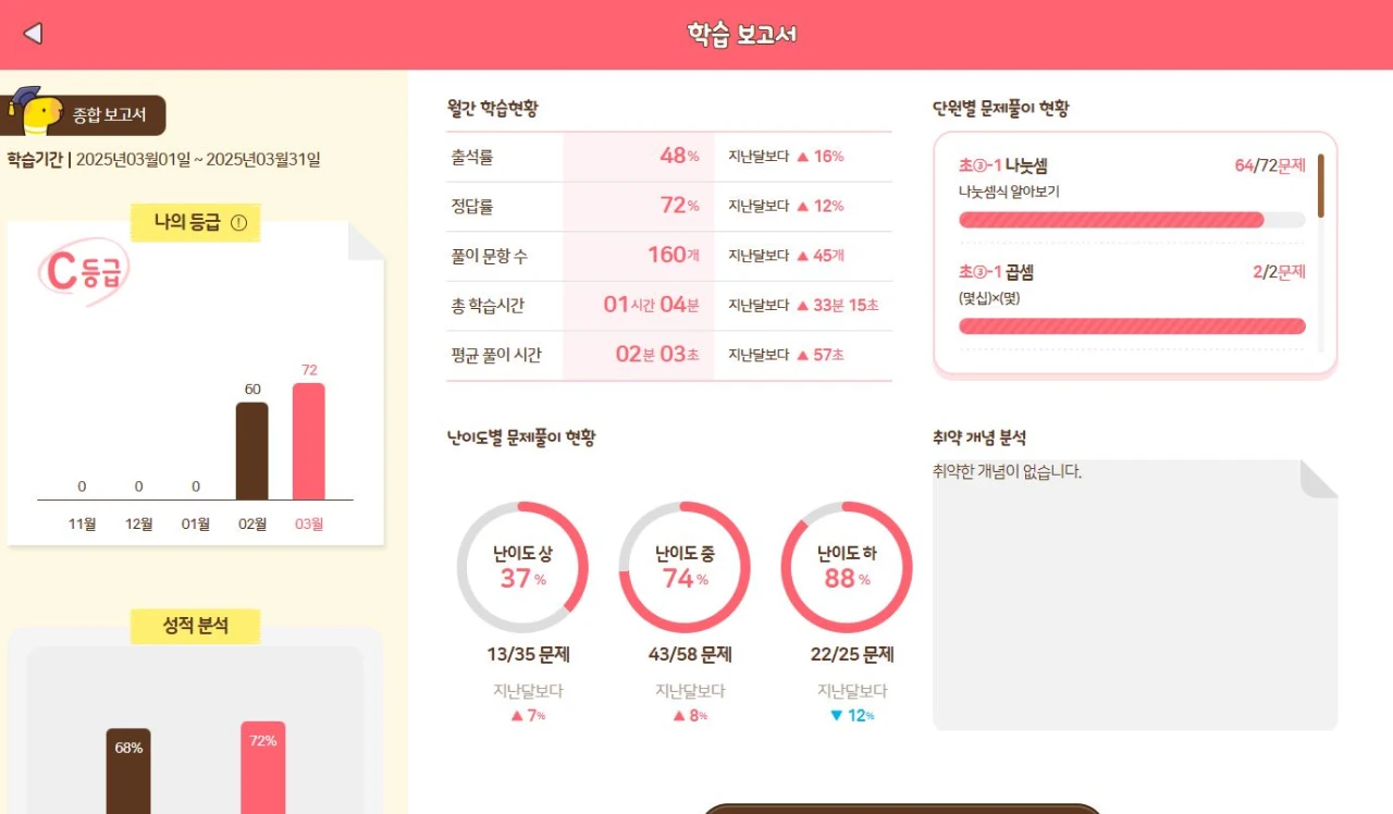 단원, 주간, 월간 리포트 및 성취도 분석 제공