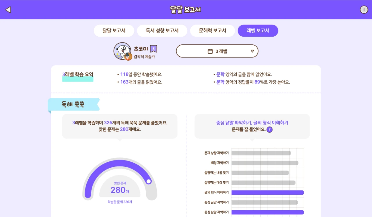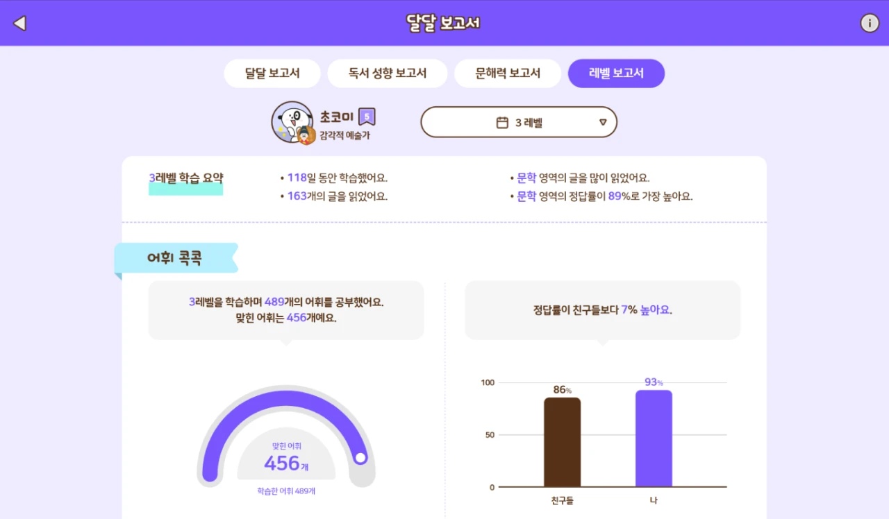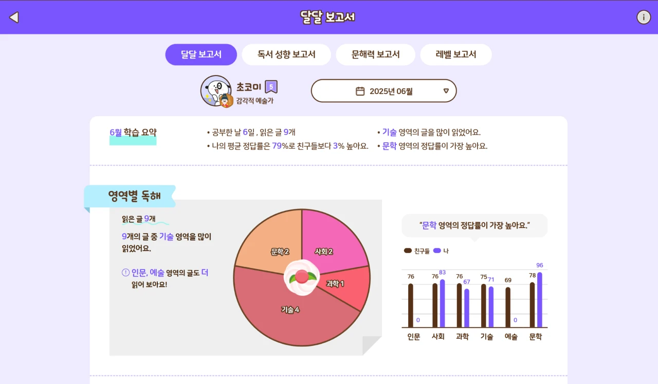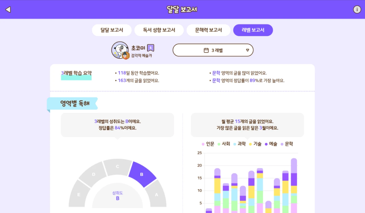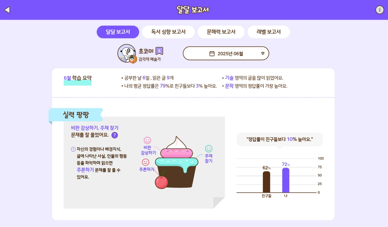 단원, 주간, 월간 리포트 및 성취도 분석 제공